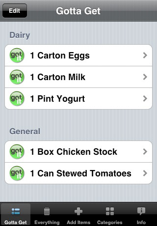 The idea is simple. There are two lists, one with everything, and one containing only the things you’ve gotta get. When you need an item swap it to the GottaGet list. When you get it, swap it back.